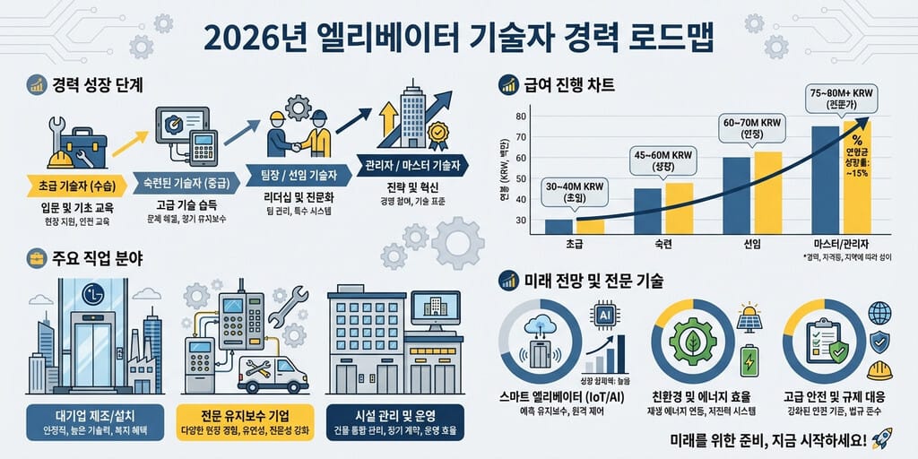 2026년 승강기기능사 취업 전망과 연봉, 그리고 실제 현장의 현실까지 모두 분석했습니다. 엘리베이터 산업의 지속적인 성장과 함께 승강기 유지보수 인력의 가치가 어떻게 변화하고 있는지 확인하고, 자격증 취득부터 취업까지의 명확하고 현실적인 로드맵을 그려보세요.