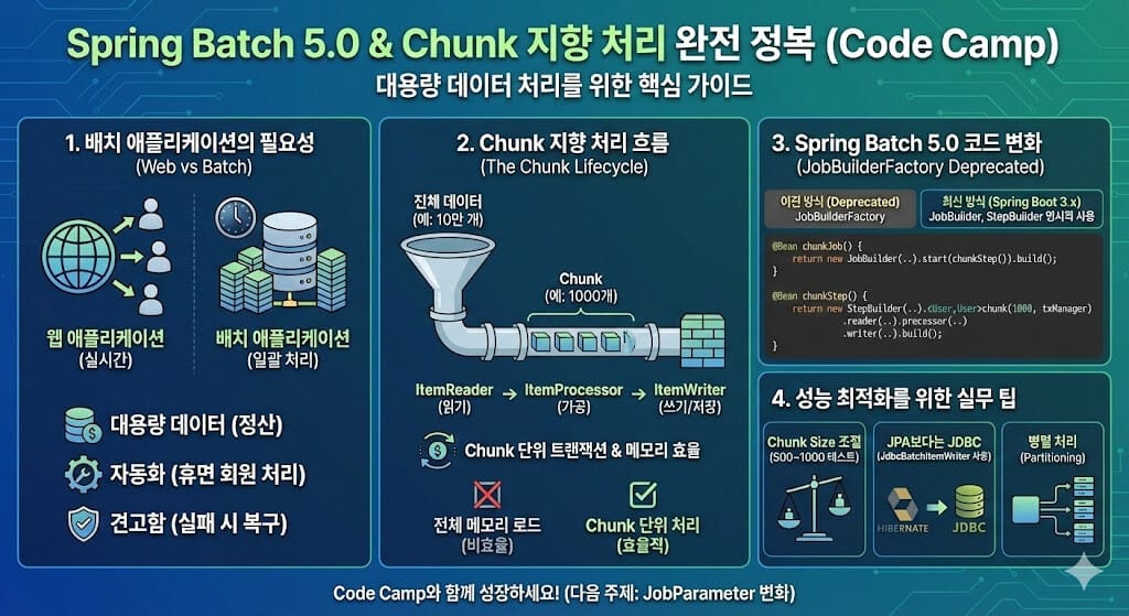 Spring Batch는 단순한 라이브러리가 아니라, 배치 처리를 위한 표준 아키텍처를 제공합니다. 오늘 소개한 Chunk 지향 처리를 잘 이해한다면, 수천만 건의 데이터도 두렵지 않을 것입니다.
